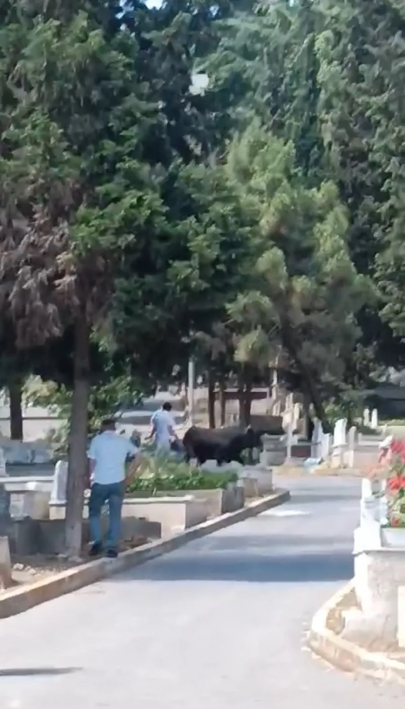 İçerideki çiçek satıcısı kadını ve mendil satan bir çocuğu yaralayan boğa ardından mezarın üstüne çıktı. Sahibinin ihbarı üzerine olay yerine belediye ekibi sevk edildi.