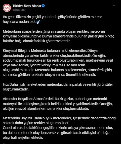İstanbul'da akşam saatlerinde gök yüzünde ortaya çıkan ışık huzmesi görenleri heyecanlandırdı. Öte yandan Türkiye'nin birçok noktasından görülen ışık huzmesi bir süre sonra gözden kayboldu. Büyük merak uyandıran cismin göktaşı olduğu iddia edilirken, gökyüzünde süzülen cisim cep telefonu kameraları ile saniye saniye görüntülendi. Türkiye Uzay Ajansı sosyal medya hesabı üzerinden açıklamada bulundu.