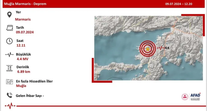 Afet ve Acil Durum Yönetimi Başkanlığının (AFAD) internet sitesinde yer alan bilgiye göre, saat 12.11'de merkez üssü Marmaris olan 4,4 büyüklüğünde sarsıntı kaydedildi.
