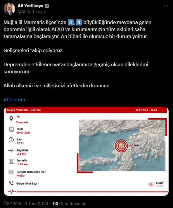 Bakan Yerlikaya, sosyal medya hesabından yaptığı açıklamada, Marmaris'te 4,4 büyüklüğünde depremin meydana geldiğini anımsattı.