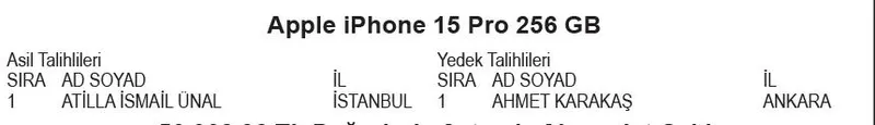 Apple iPhone 15 Pro 256 GB kazanan asil ve yedek talihliler