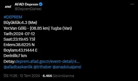 Afet ve Acil Durum Yönetimi Başkanlığı (AFAD), sosyal medya hesabından Van'ın Tuşba ilçesinde 4.3 büyüklüğünde deprem meydana geldi.