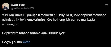Balcı, "Saat 23.19'da ilimiz Tuşba ilçesi merkezli 4,3 büyüklüğünde deprem meydana gelmiştir. İlk belirlemelerimize göre herhangi bir can ve mal kaybı olmamıştır. Ekiplerimiz sahada taramalarını sürdürüyor. Geçmiş olsun Van." ifadelerini kullandı.