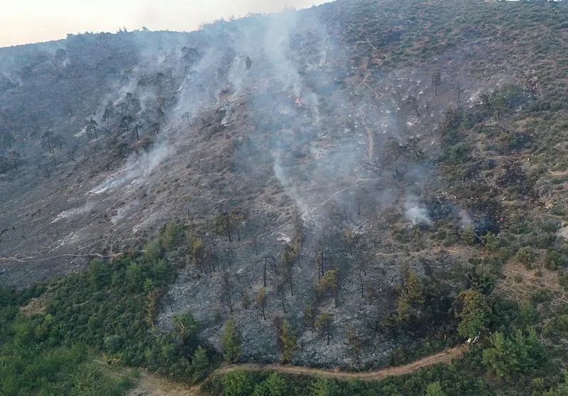 Yangın çıkan ormanlık alan ve bölgedeki soğutma çalışmaları, drone ile havadan görüntülendi.