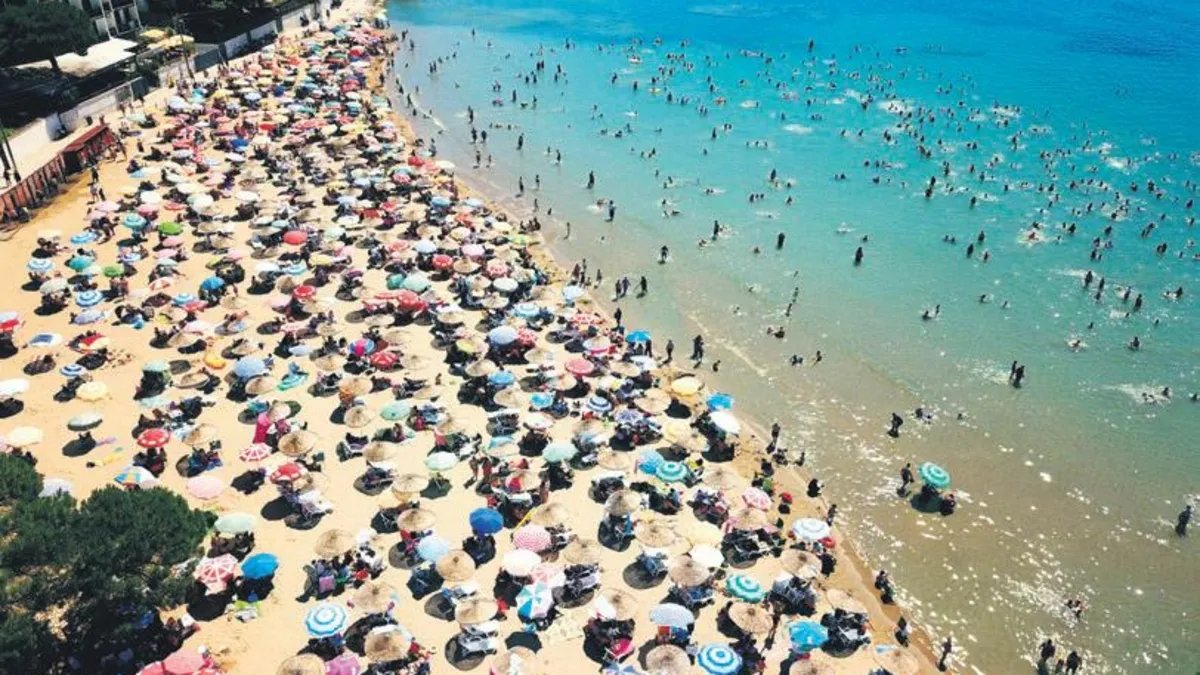 Kocaeli'nin Kandıra İlçesi'ndeki mavi bayraklı plajlar, hafta sonu kent sakinleri ve çevre illerden gelen tatilcilerle dolup, taştı. Plajların dolması ile Akdeniz sahillerini aratmayan manzaralar ortaya çıktı.