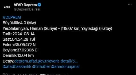 Suriye'nin Salamiyah, Hamah bölgesinde saat 04.54 sıralarında yerin 13.04 km altında 4.0 büyüklüğünde bir deprem daha meydana geldi.