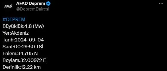 AFAD, Akdeniz'de 4.8 büyüklüğünde deprem meydana geldiğini açıkladı