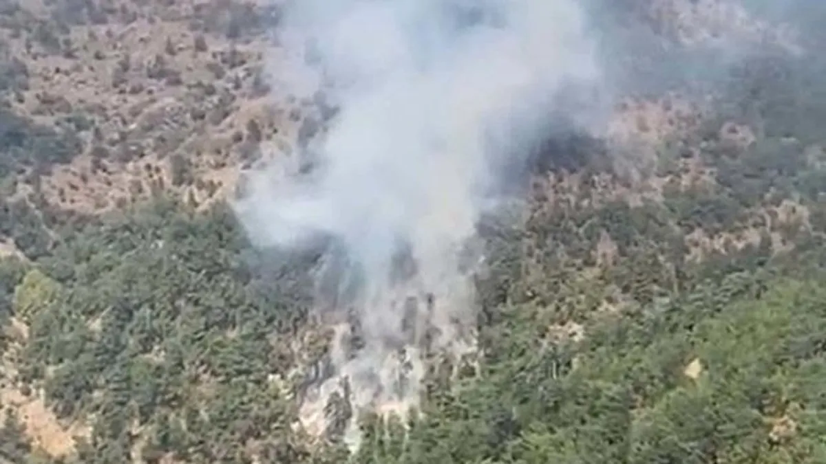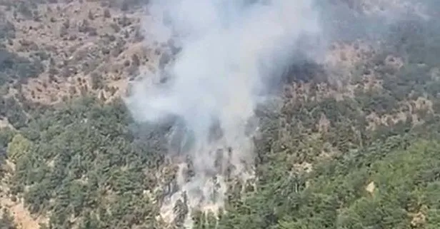 Yangının çıkış nedeni araştırılırken, sarp arazideki alevlere havadan ve karadan müdahale sürüyor.
