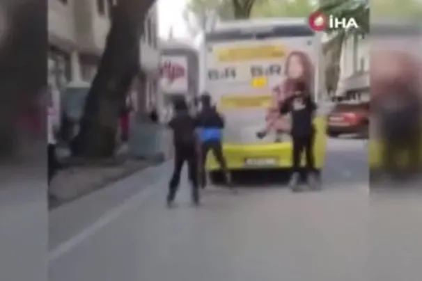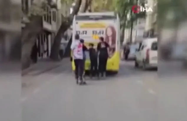 Otobüsün arkasında tehlikeli bir şekilde ilerleyen gençler, trafiği riske atarken rahat tavırlarıyla dikkat çekti.