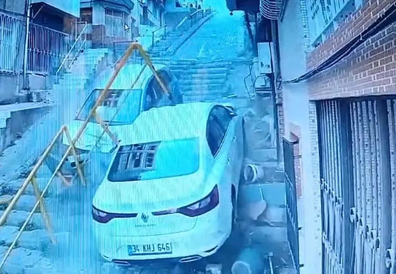 İzmir'in Konak ilçesinde akılalmaz bir kaza meydana geldi. Alkollü sürücünün kullandığı otomobil, çarptığı park halindeki başka bir araçla merdivenlere düştü. Kaza güvenlik kamerasına yansırken, yaralanan sürücü tedaviye alındı.