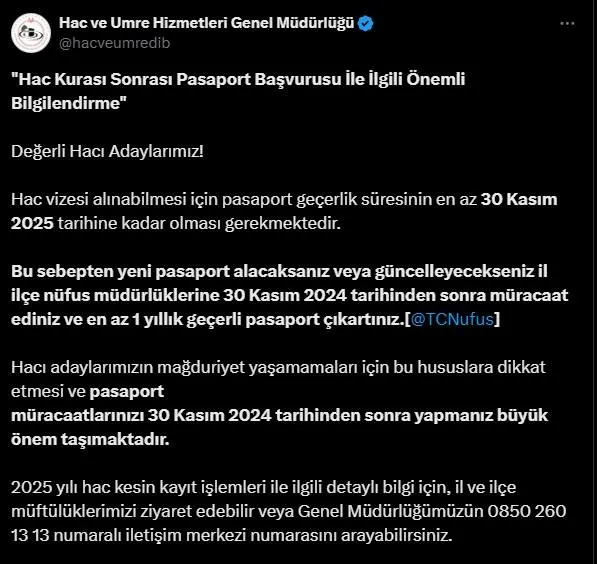 Diyanet İşleri Başkanlığı Hac ve Umre Hizmetleri Genel Müdürlüğü sosyal medya hesabından yaptığı paylaşımda, "Hac vizesi alınabilmesi için pasaport geçerlik süresinin en az 30 Kasım 2025 tarihine kadar olması gerekmektedir. Bu sebepten yeni pasaport alacaksanız veya güncelleyecekseniz il ilçe nüfus müdürlüklerine 30 Kasım 2024 tarihinden sonra müracaat ediniz ve en az 1 yıllık geçerli pasaport çıkartınız. Hacı adaylarımızın mağduriyet yaşamamaları için bu hususlara dikkat etmesi ve pasaport müracaatlarınızı 30 Kasım 2024 tarihinden sonra yapmanız büyük önem taşımaktadır. 2025 yılı hac kesin kayıt işlemleri ile ilgili detaylı bilgi için, il ve ilçe müftülüklerimizi ziyaret edebilir veya Genel Müdürlüğümüzün 0850 260 13 13 numaralı iletişim merkezi numarasını arayabilirsiniz" dedi.