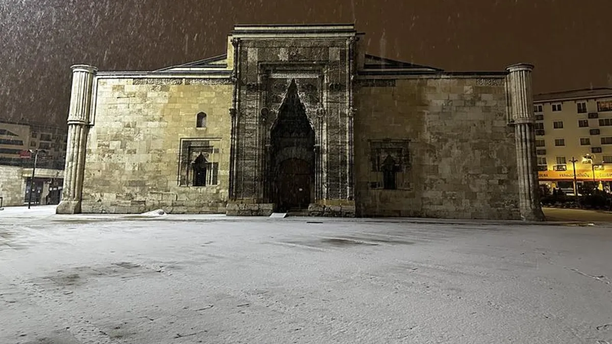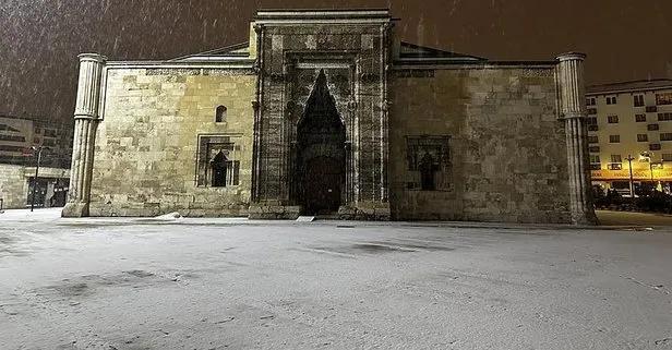 Meteorolojinin uyarılarının ardından Sivas'ta gece saatlerinde yoğun kar yağışı etkili oldu. Termometrelerin sıfırın altında 1 derece gösterdiği kentte etkili olan kar yağışı tarihi kent meydanında masalsı görüntüler sundu.