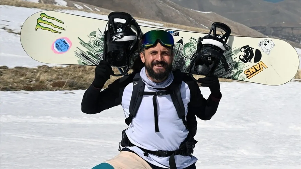 Van'ın Gevaş ilçesinde bir grup kayakçı, önceki gün metrelerce karın bulunduğu 3 bin 550 metre yüksekliğindeki Artos Dağı'na tırmandı. Yaklaşık 4 saat süren zorlu tırmanışla zirveye ulaşan kayakçılar, bir süre mola verdikten sonra yüksek eğimli bölgeden snowboard ile slalom yaparak inmeye başladı.