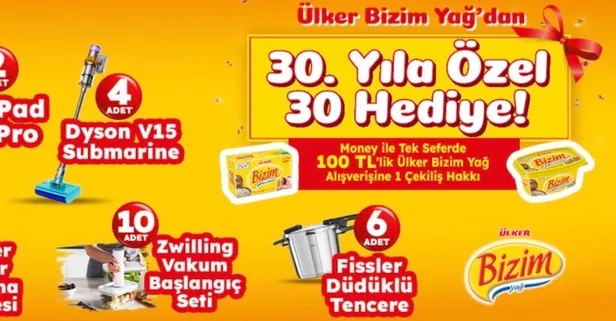 Migros Ülker Bizim Yağ 30 Mayıs 2025 çekiliş sonucu belli oldu. Çekilişe katılan talihliler, Ipad Pro 11" 256 gb wi-fi, Dyson V15 Submarine, Fissler düdüklü tencere 6 LT, Schaffer Prochef Master Stand Mixer, Zwilling Vakumlu Başlangıç Seti kazandı. İşte asil ve yedek talihliler...