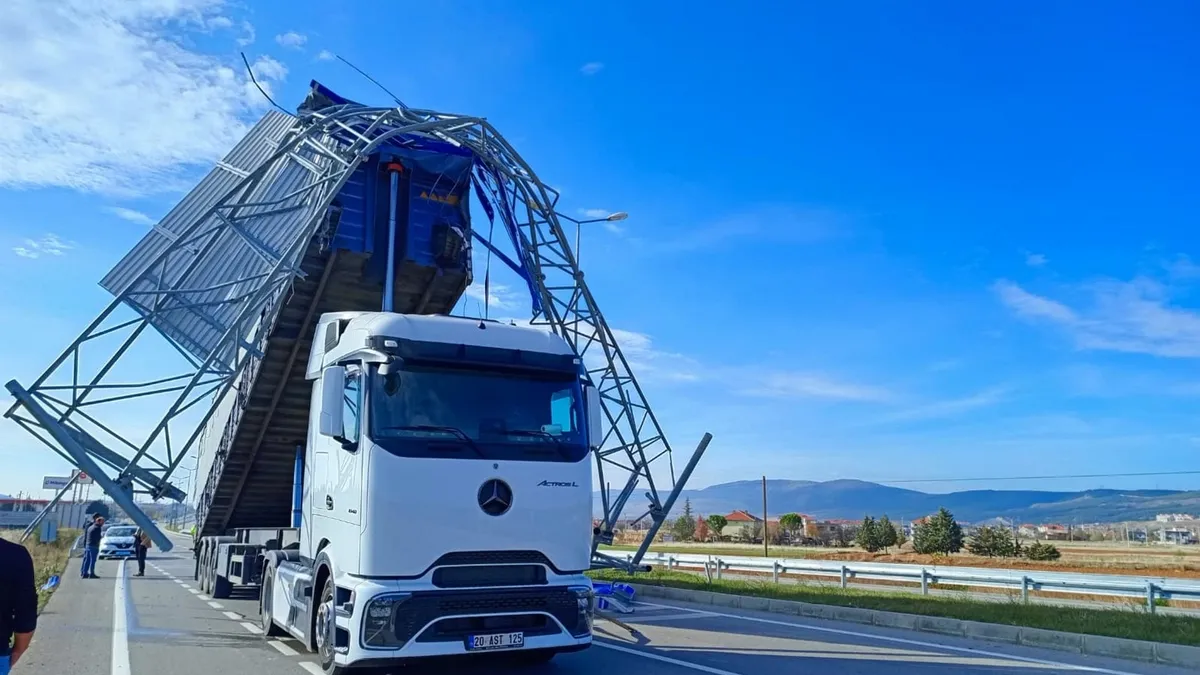 Denizli–Uşak kara yolunda seyir halindeyken dorsesi açık kalan tır, kavşaktaki büyük trafik levhasına çarparak devirdi. Kazanın ardından yol trafiğe kapanırken olayda yaralanan olmadı.