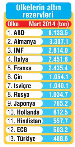 Son verilere göre; ABD 8.133 ton altın rezervi ile ilk sırada yer alırken, 3.387 ton ile Almanya ikinci, 2.451 ton ile İtalya dördüncü sırada yer alıyor. Çin 1.054 ton, Rusya 1.034 ton altın rezervi ile altıncı ve sekizinci sırada yer alıyor.